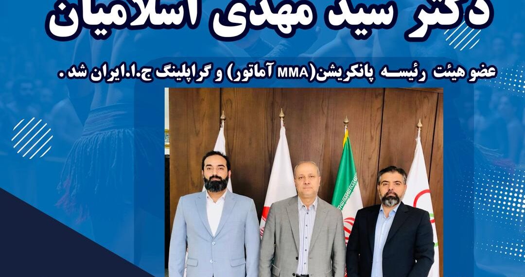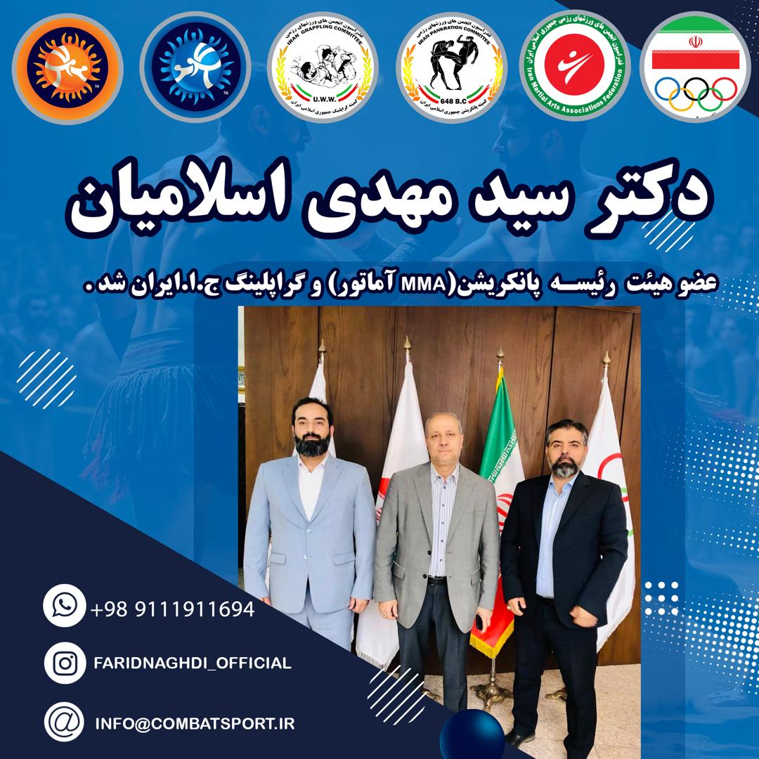 طی حکمی از سوی جناب آقای استاد فرید نقدی ریاست محترم انجمن پانکریشن و گراپلینگ جمهوری اسلامی ایران جناب آقای دکتر سید مهدی اسلامیان به سِمَت عضو هیئت رئیسه پانکریشن(MMA آماتور) و گراپلینگ انجمن منصوب گردید.